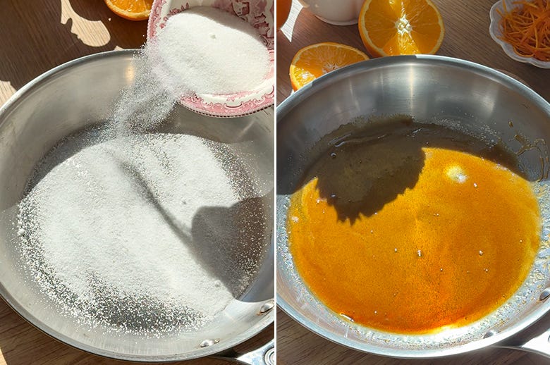 1. Melt the sugar in a skillet over medium heat until it becomes a light golden caramel. Watch it carefully - you want golden, not burnt!