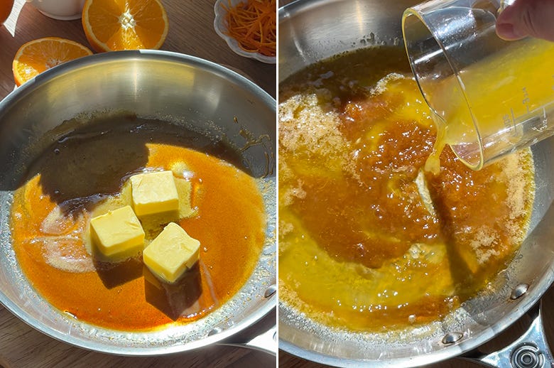 2. Add the butter and stir to combine. Don’t worry if it looks a bit uneven at first - this is completely normal and it will come together. Pour in the orange juice and cook, stirring constantly, until the sauce becomes completely smooth and thickens slightly.