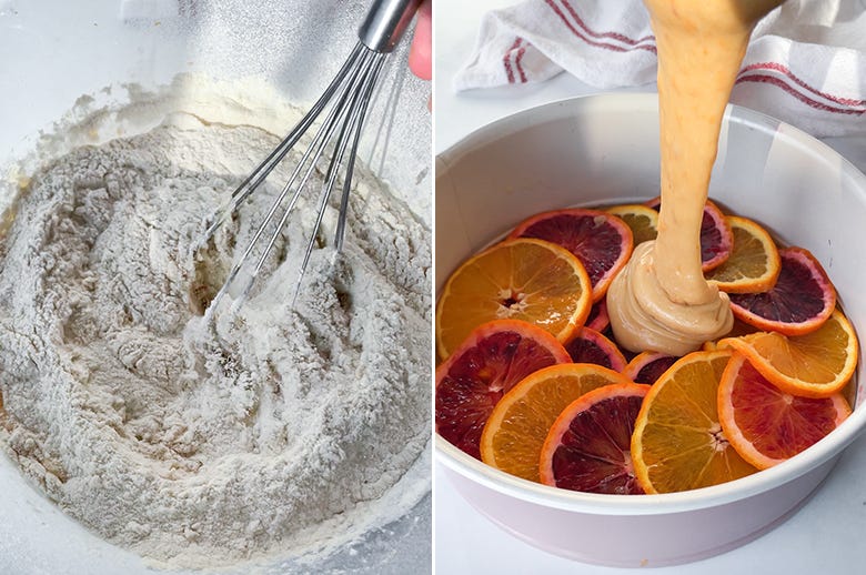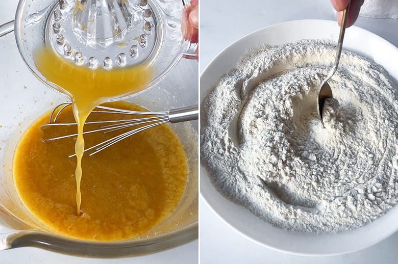 7. Add the orange juice and give it a stir. In a separate bowl, whisk together the flour, baking powder, and salt, then sift this into your wet ingredients. Mix until you have a smooth, pourable batter (don’t overmix — just until everything comes together).