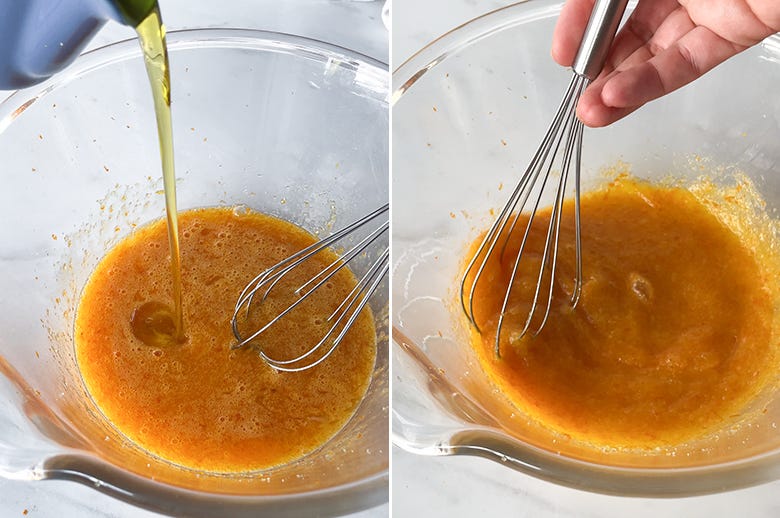6. Pour in the olive oil and whisk until smooth and emulsified.