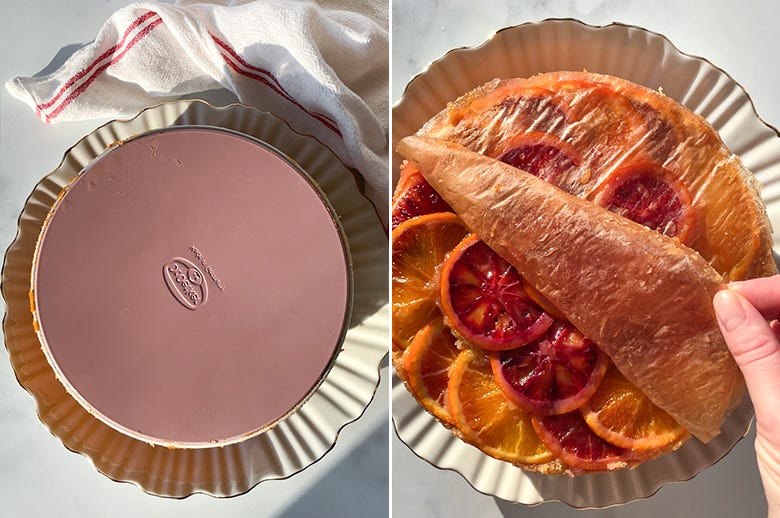10. Let the cake cool in the pan for 5-10 minutes — not longer! Run a knife around the edges if needed, place a serving plate over the pan, take a deep breath, and confidently flip the whole thing over. Lift off the pan and peel away the parchment.