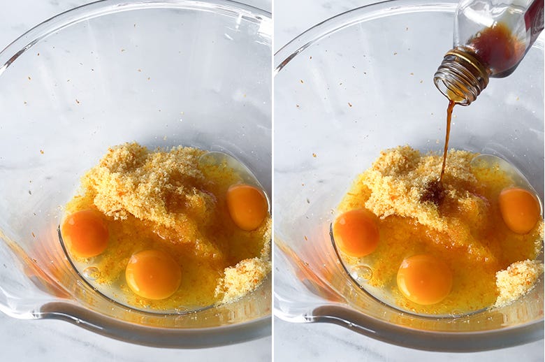 5. Add the eggs and vanilla extract to the orange sugar. Whisk until combined — a hand mixer works, but a regular whisk is perfectly fine too.