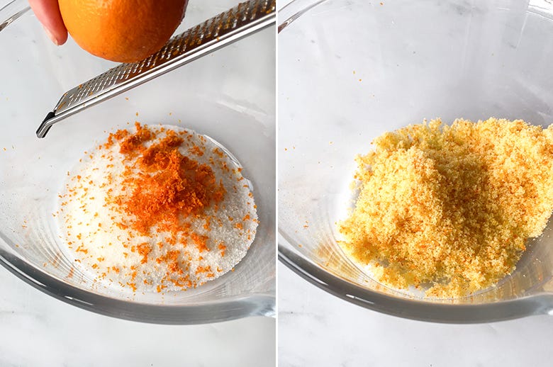 4. Now for the magic: combine the orange zest with the sugar in a bowl and rub it together with your fingers. Really work it until you can smell the oranges and the sugar feels slightly damp. Mmm... your kitchen already smells incredible.
