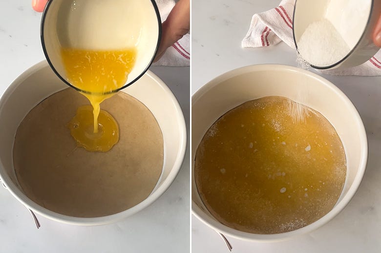2. Pour the melted butter into the prepared pan and spread it around to coat the entire bottom. Sprinkle the sugar evenly over the butter (this is what creates that gorgeous caramelized top!).